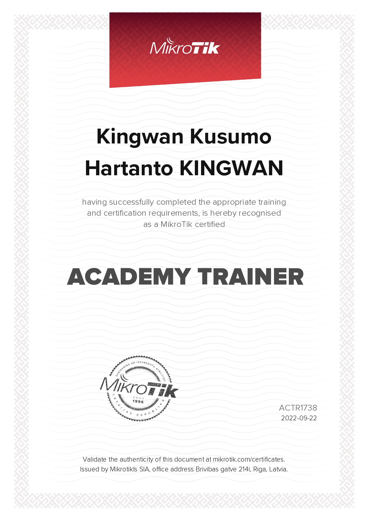 Sertifikat kompetensi MTCNA dikeluarkan langsung oleh MikroTik Latvia dan diakui serta berlaku secara internasional. Bagi sekolah Ini adalah peluang bagus untuk menarik lebih banyak pelajar dengan menawarkan sertifikat MikroTik yang dapat dikenali oleh calon pemberi kerja di seluruh dunia. Siswa dapat memperoleh pengakuan internasional sertifikat (MTCNA) yang menegaskan akademik mereka kredensial.